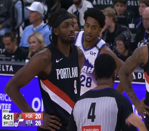 首节比赛中,杨瀚森得到不到4分钟的出场时间,在内线出手1次命中。杨瀚森在场时,开拓者的进攻没什么问题,但防守防不住,爵士的战术比较针对杨瀚森,老将努尔基奇打出信心,在造成杨瀚森掉球失误后,杨瀚森被换下场。首节后半段,爵士打出11-0,本节结束时开拓者33-43落后。