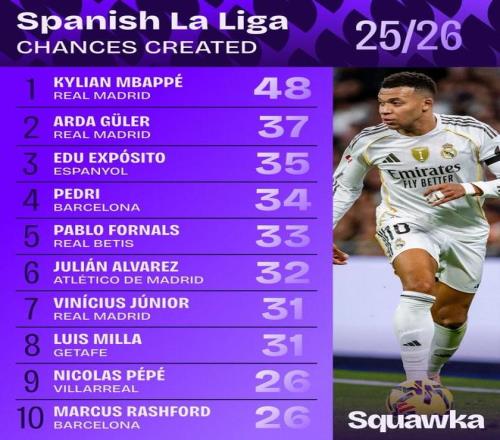 根据统计,本赛季到目前为止,姆巴佩是西甲当中创造机会最多的球员,居莱尔位居第二,西班牙人中场埃杜位居第三。