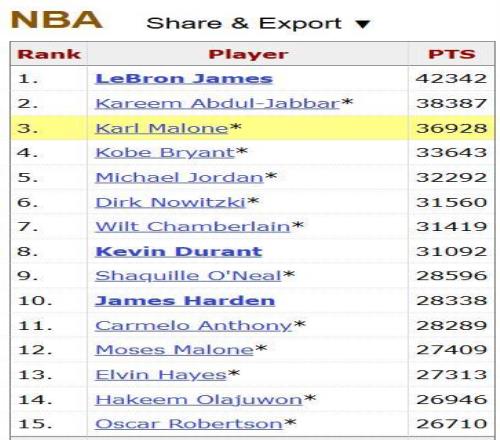 截至目前,詹姆斯以42342分高居历史总得分榜第一位。