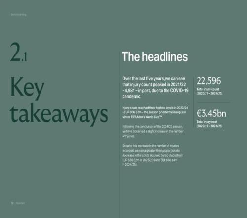 12月16日,英国豪顿保险公司发布了《2024/25赛季欧洲足球伤病报告》。这份厚达286页的报告披露了震惊世界的五大联赛“伤病成本”金额:最近5个赛季,五大联赛共出现22596人次伤病,俱乐部的“伤病成本”达34.46亿欧元。英超俱乐部伤病次数占24%,“伤病成本”(13.79亿欧元)占比高达40%,金额超过排名其后的西甲(6.01亿)和德甲(5.80亿)总和。
