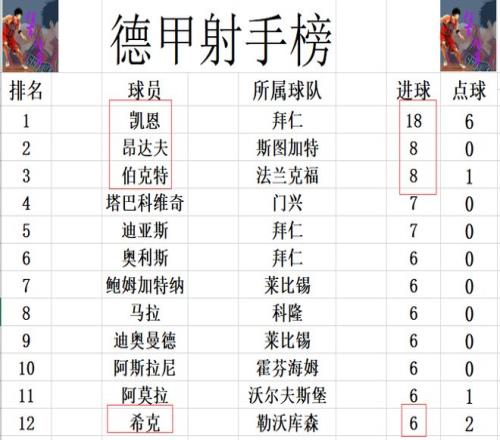 射手榜方面,凯恩18球遥遥领先,昂达夫,伯克特差了10球之多并列第2。迪亚斯,塔巴科维奇7球并列第4,希克今天打入一球后,追上奥利斯,鲍姆加特纳等人6球刚好挤入前十。
