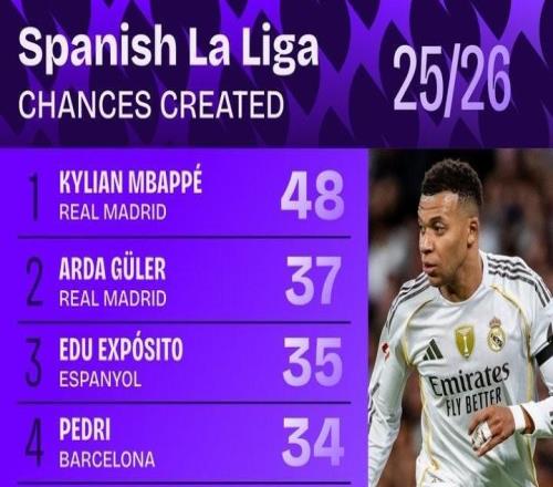 本赛季西甲创造机会榜:姆巴佩48次居首,居莱尔37次第二 -